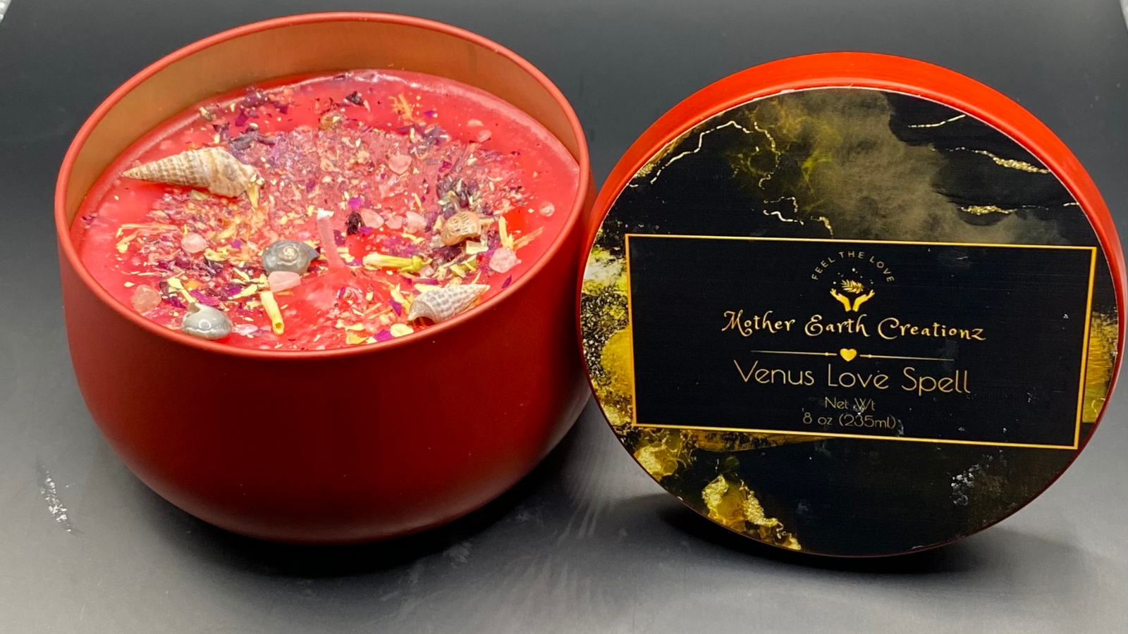 Introducing our Venus Love Spell candle, a powerful and enchanting candle from Mother Earth Creationz Candle collection. Infused with rose quartz, essential oils, seashells, and rose petals, this candle is designed to awaken and attract the energy of love and beauty into your life. Each candle has been serenaded with beautiful love music and frequencies, enhancing the power of the candle's intention. Light this candle and feel the gentle and nurturing energy of rose quartz infuse your space, while the intoxicating aroma of essential oils and rose petals fill the air.